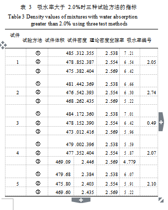 體積法適用于空隙率較大的瀝青碎石混合料及大空隙透水性開級配瀝青混合料。體積法因所測定試件體積準(zhǔn)確度不高 ,所測密度誤差較大,在目前壓實瀝青混合料試驗中應(yīng)用甚少。只有在吸水率特別大,前面三種試驗方法不能準(zhǔn)確測定的情況下選用。因此 ,本文對體積法不進(jìn)行分析比較。